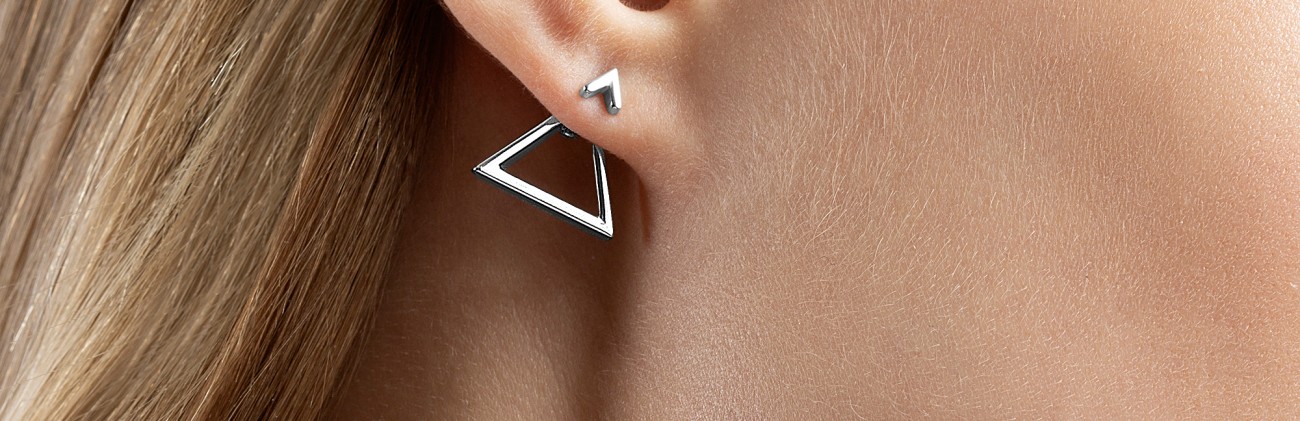 Серебряные серьги-трансформеры TRIADA – украшение в стиле современный минимализм. Комбинация съемных элементов позволяет получить три варианта украшения, помноженное на две длины. Без камней и вставок. Имеют декоративное и надежное защитное покрытие белым родием. Такое же покрытие используется в изделиях из белого золота 585 пробы. Родий – драгоценный металл платиновой группы и, нанесенный на поверхность украшения, позволяет сохранить его первоначальный вид, защищая от механических повреждений и потемнения. Толщина покрытия 10 мкм. Надеваются и застегиваются серьги так же, как серьги-гвоздики. Удобный и компактный силиконовый фиксатор в оправе из родированного ювелирного сплава позволяет просто и надежно зафиксировать украшение на любой мочке уха. Размер застежки 5,5х5 мм. Длина штифта для фиксации застежки 10 мм, диаметр штифта 0,8 мм. Более тонкий штифт, чем у стандартных винтовых застежек (1,2 мм) обеспечивает максимальный комфорт при надевании и ношении. Размер малой несъёмной части 4 мм, размер стороны большого треугольника 14,5 мм, толщина проката 1,5 мм.